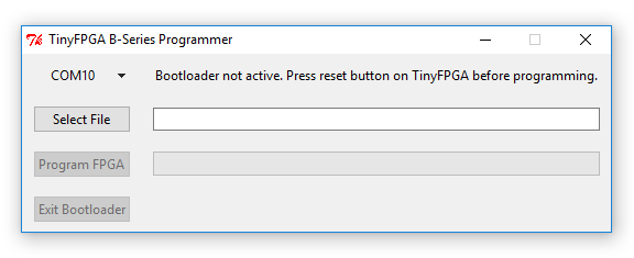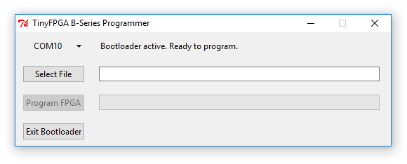 The bootloader on the B-Series boards will present itself as a serial port. The programmer application will display serial port identifiers for each TinyFPGA board it can program.