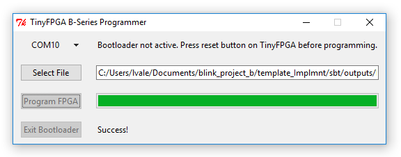 The programmer application will verify the bitstream was written correctly and report ‘Success!’ if all is well. The programmer should also report that the bootloader is not active. This is because the bootloader does not consume any FPGA resources while the user configuration is running. The bootloader can be enabled again by pressing the reset button on the TinyFPGA board.