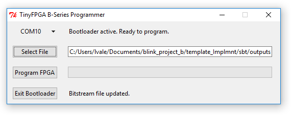 Select the bitstream to program. This will be buried a few directories under the project: template_Implmnt/sbt/outputs/bitmap/TinyFPGA_B_bitmap.hex