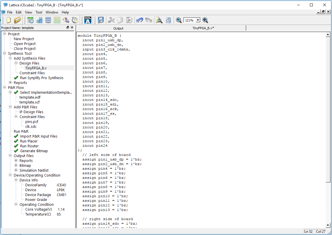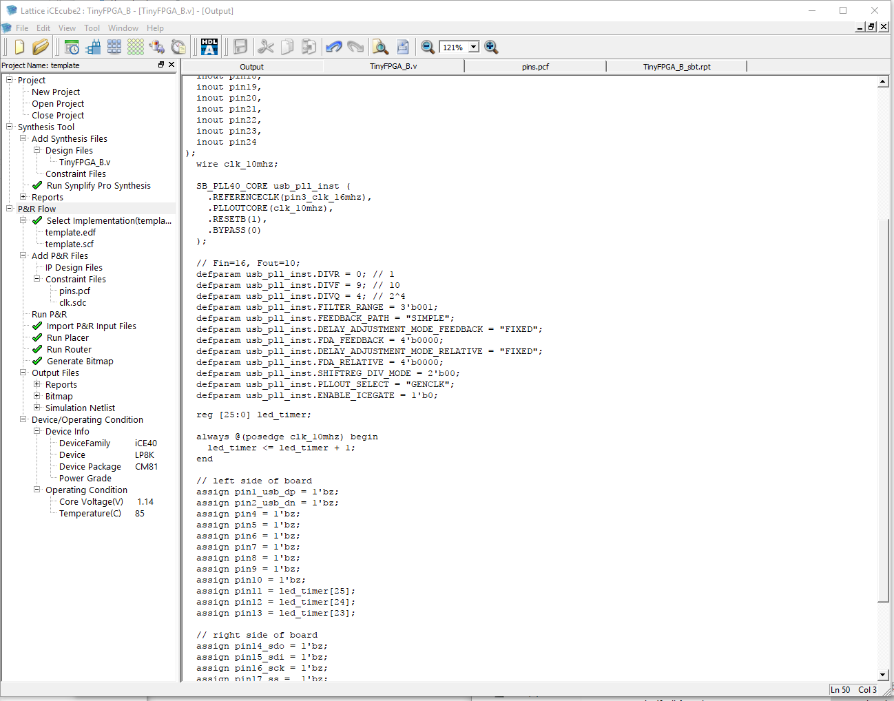Install Pythonon the installer. For Linux, MacOS, and other posix operating systems, make sure you have Python 2.7 and run thetinyfpgab.pyPython script. - The TinyFPGA B-Series GitHub Repository has Lattice iCEcube2 template projects that you may find useful. They include an empty top-level verilog module with pin constraints to map board pins to the correct IOs on the iCE40 FPGA chip. You could download the latest files directly in a zip file or clone the repo using git.
