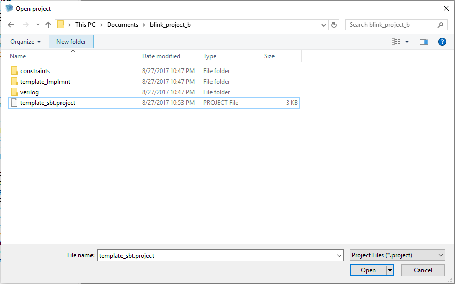 Open the Lattice iCEcube2 application. From the File menu select Open and Project.... In the newly opened file chooser, navigate to the blink_project_b directory you just created and select the template_sbt.project project file.