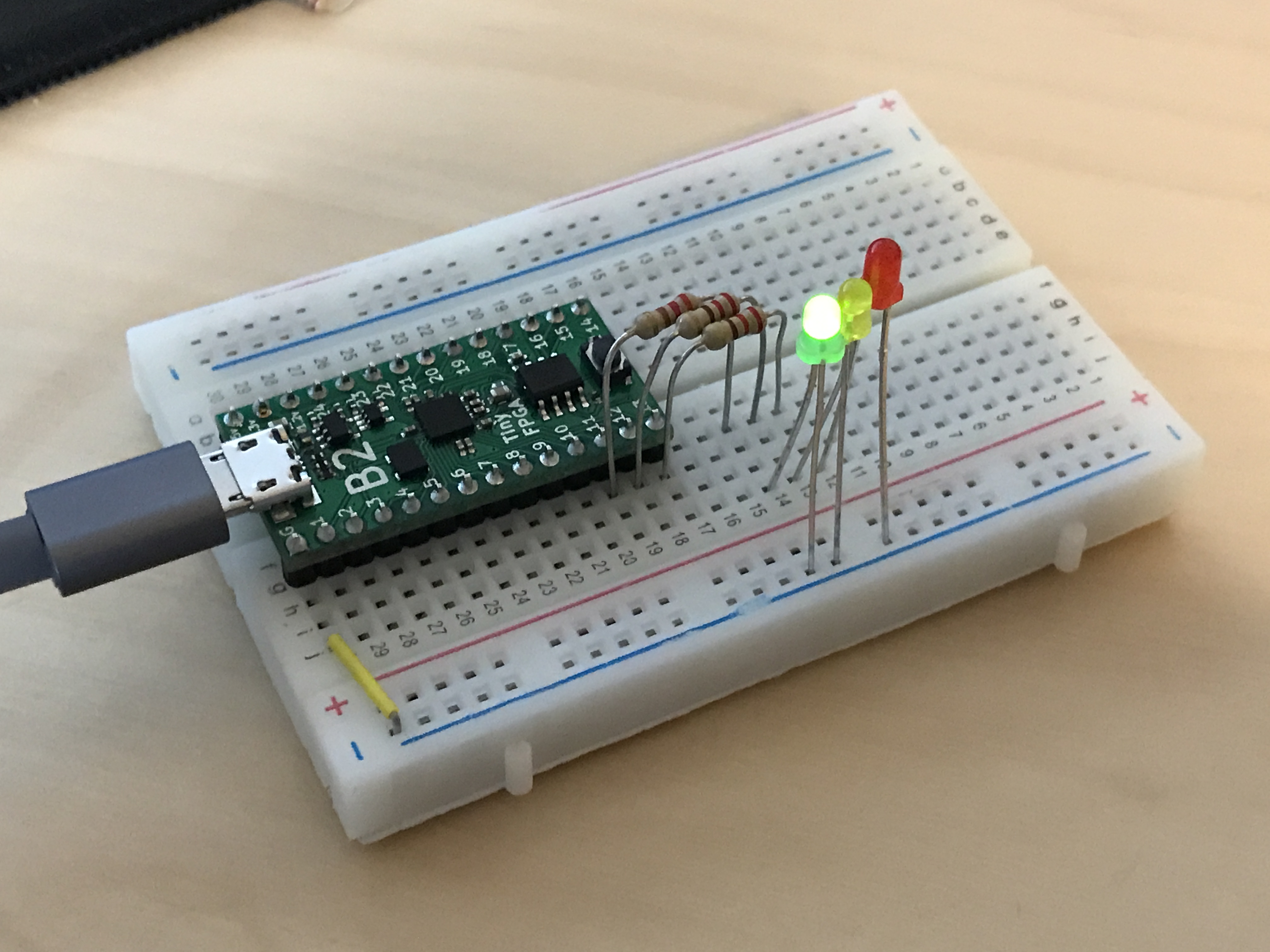 Now that your board has pins on it it can be inserted into a solderless breadboard. In my breadboard I am using the built-in micro USB port to provide power. I connected LEDs to pins 11, 12, and 13 with 220 ohm resistors in series.